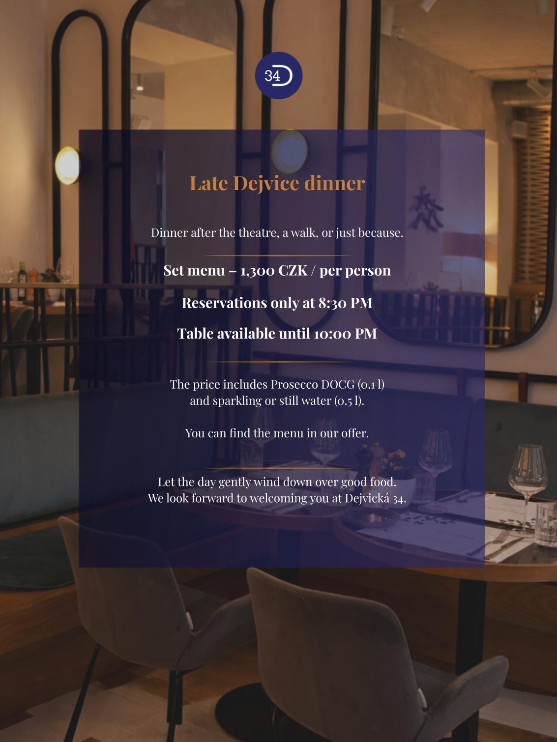 Dejvická 34 is not located in the historic tourist centre of Prague, but it is very close by — and the short journey is well worth it. Tomáš enjoys personal contact with guests. Together with him, Dejvická 34 is shaped by a stable team of professionals, often long-standing colleagues and close friends. As a result, the restaurant offers a natural, relaxed atmosphere without unnecessary formality.